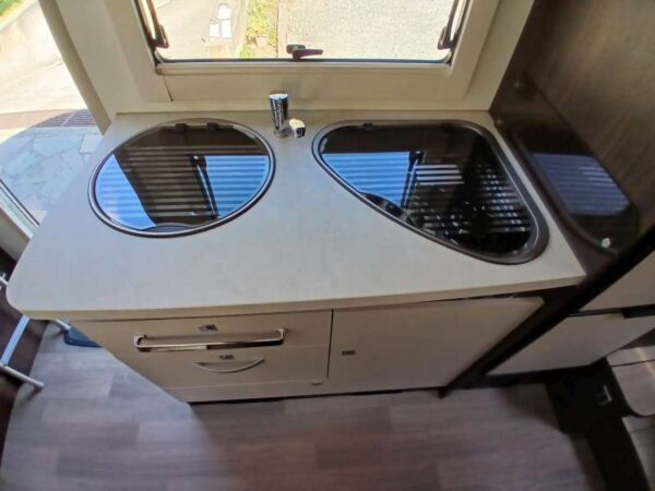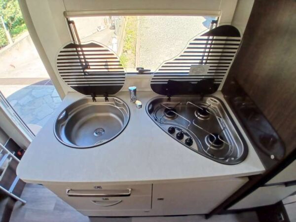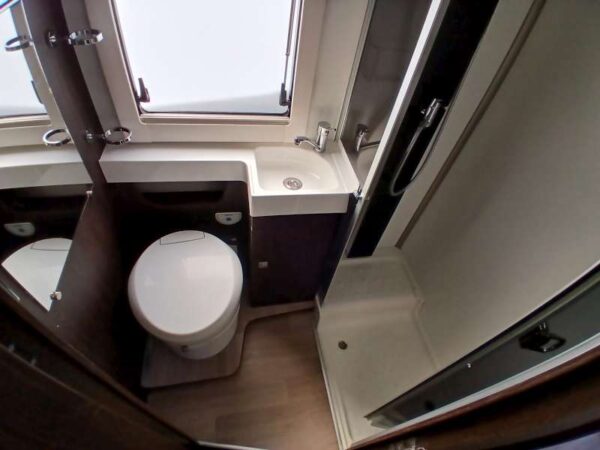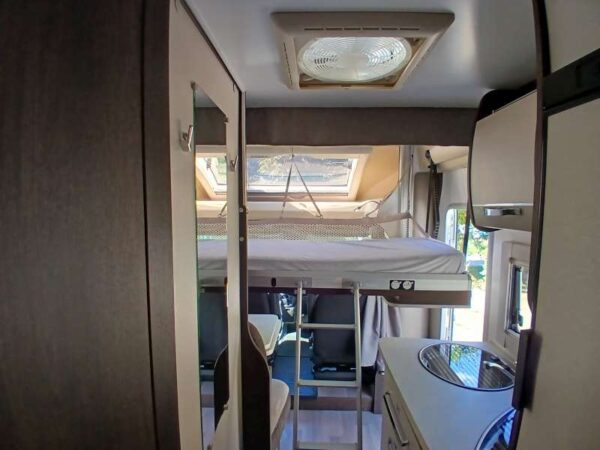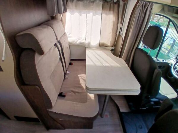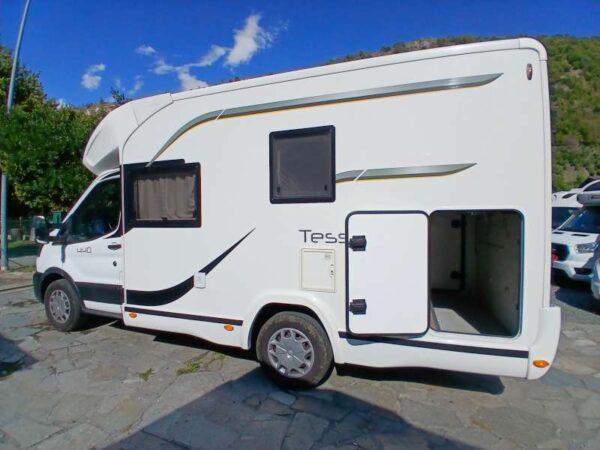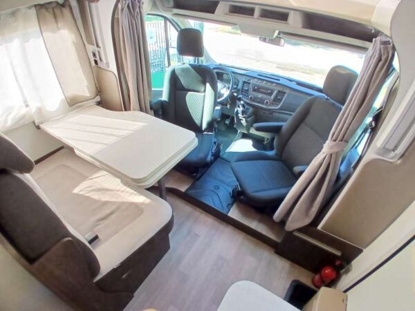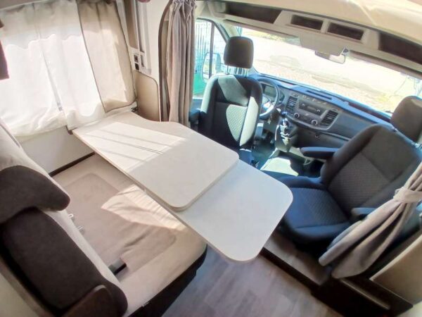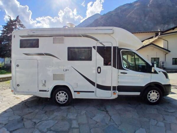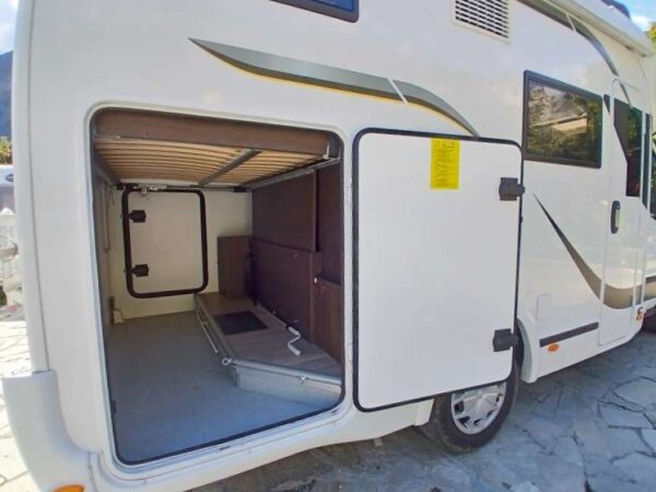 Semintegrale compatto 4 posti, con letto matrimoniale trasversale posteriore ad altezza regolabile con grande garage di stivaggio e un basculante elettrico anteriore 1 piazza, un ulteriore letto singolo nella dinette, bagno con doccia separata, grande frigorifero, pannello solare, riscaldamento a gasolio, tendalino, turbovent, portabici.